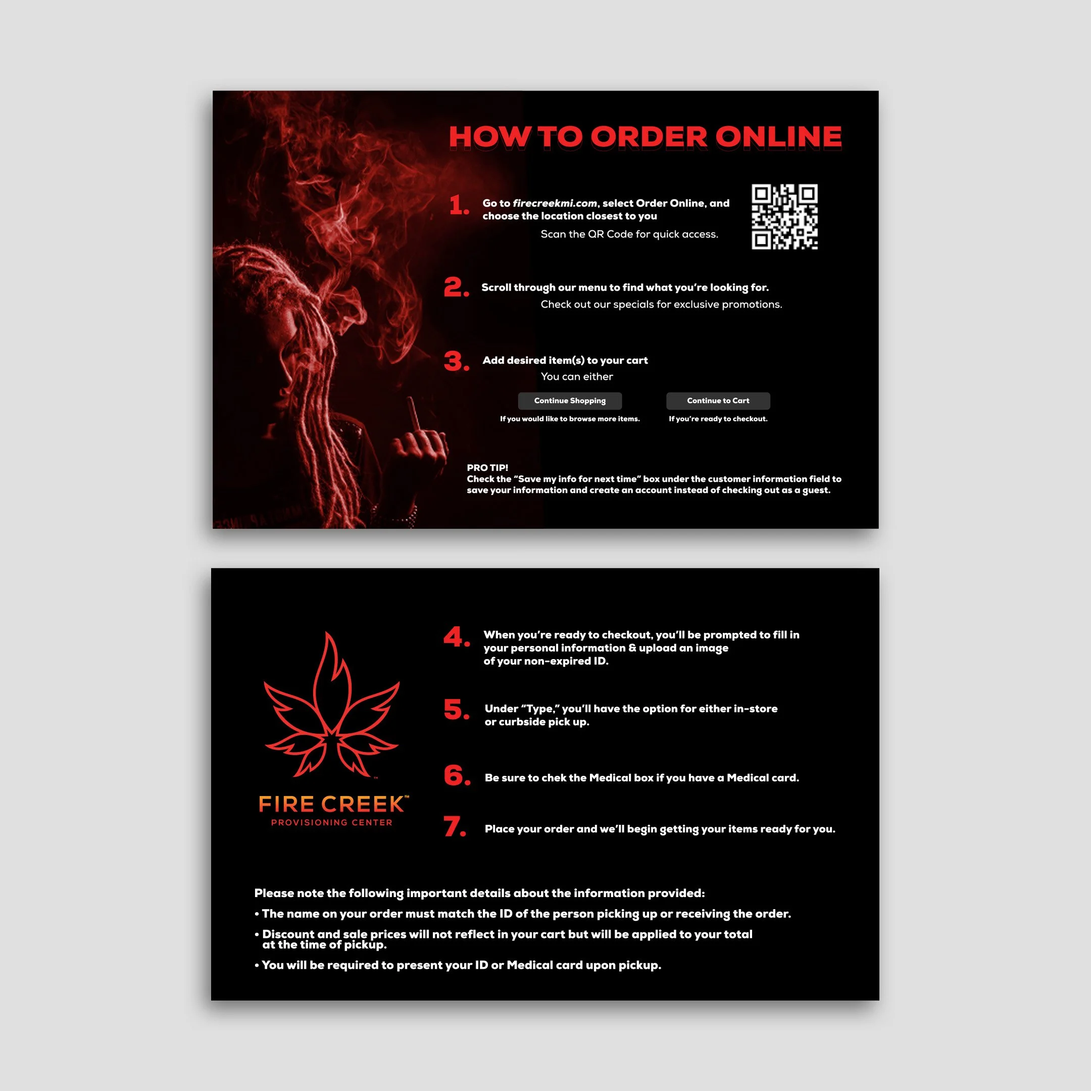 We developed a variety of print materials for Fire Creek, including details on the process of ordering online and birthday coupons. Each printed item was designed to be cohesive with Fire Creek’s darker, clean grunge aesthetic. This consistency in branding across all materials helped reinforce their unique identity and effectively communicated important information to customers.