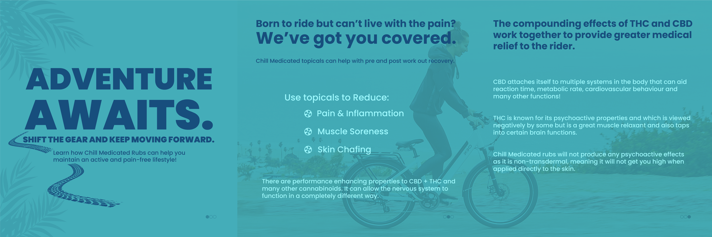Chill Medicated's carousels are primarily designed to be informative, explaining what each product is, what it does, and the different levels of strength available. This approach ensures that customers have a clear understanding of the product offerings and their benefits, all while staying consistent with the brand’s relaxed, beachy vibe.