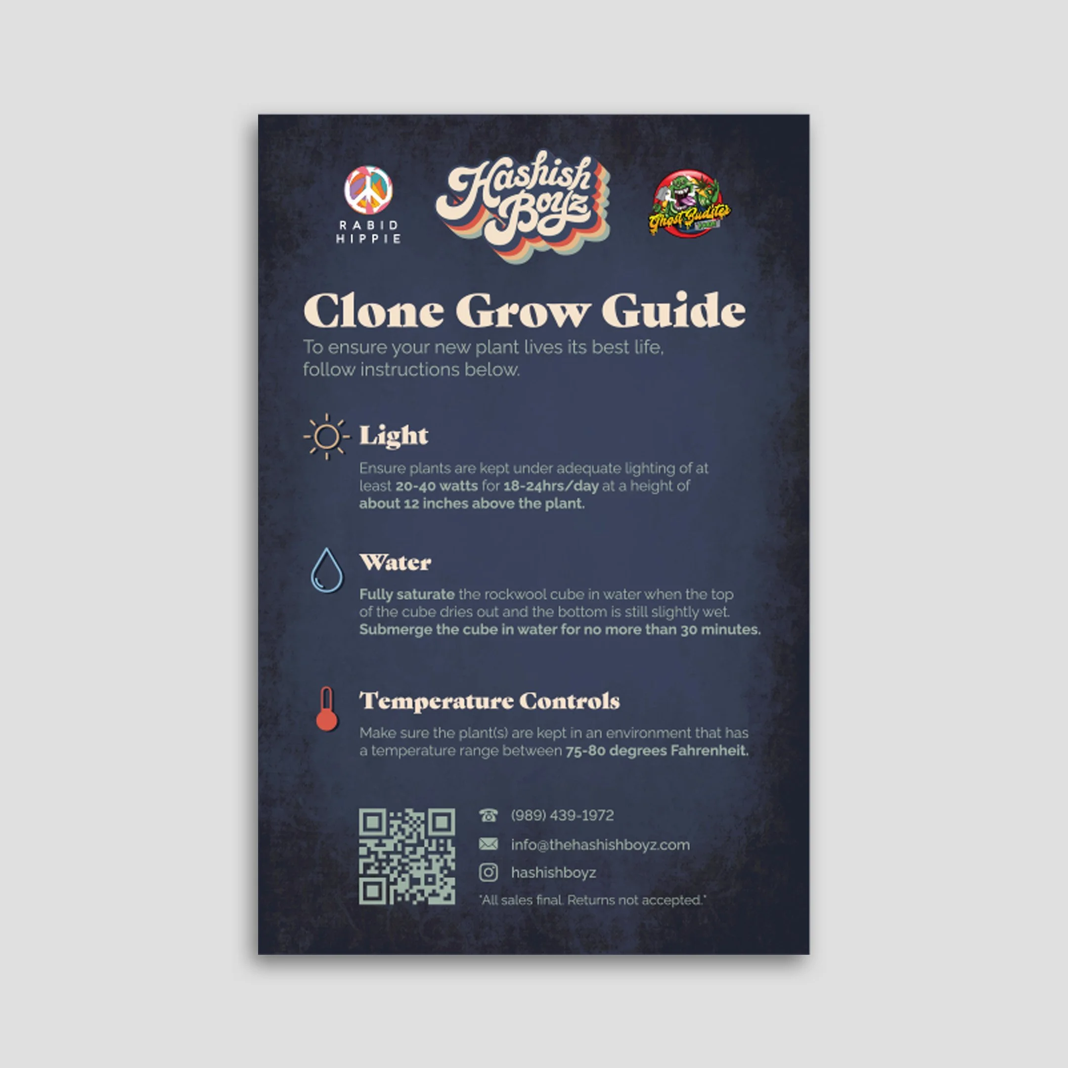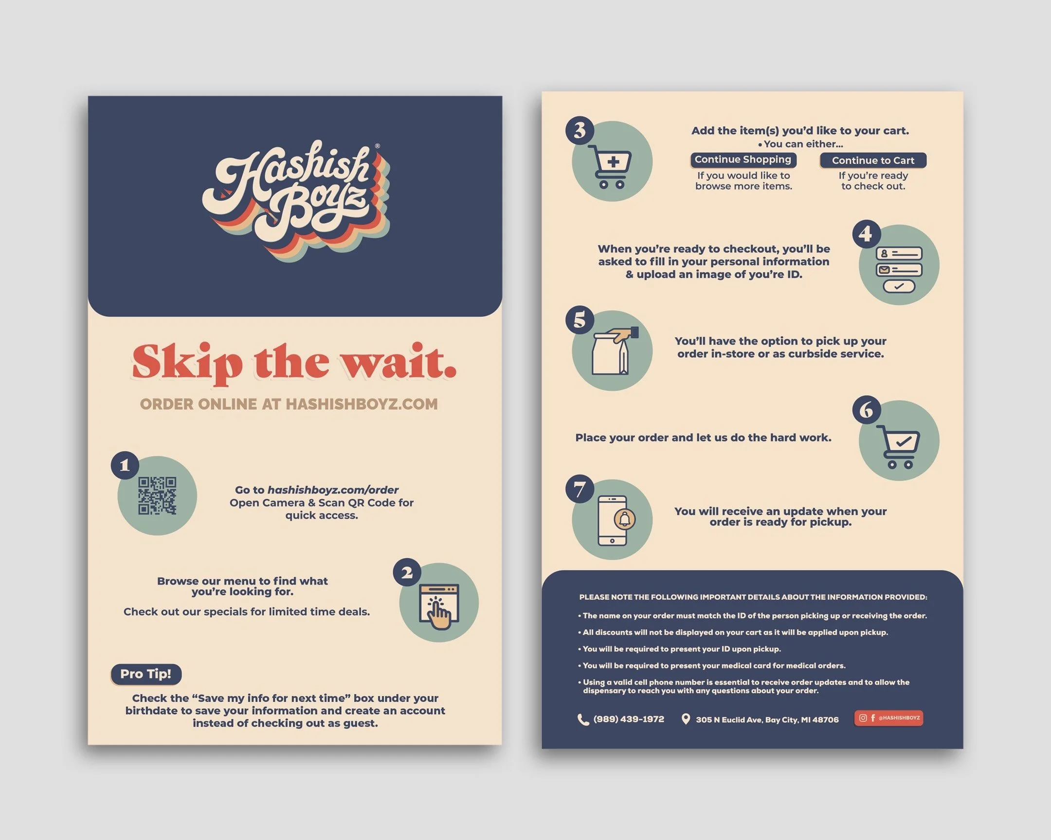 We developed a variety of print materials for Hashish Boyz, including directions on how to care for clones and details on the process of ordering online. Each printed item was designed to be cohesive with the brand’s retro vintage style, promoting the convenience of their new card payment options. This consistency in branding across all materials helped reinforce their unique identity and effectively communicated important information to customers.